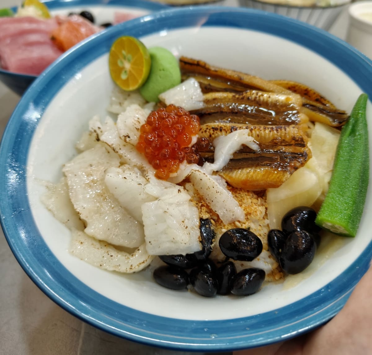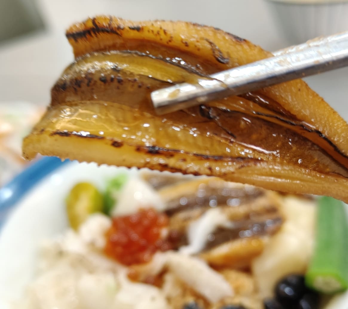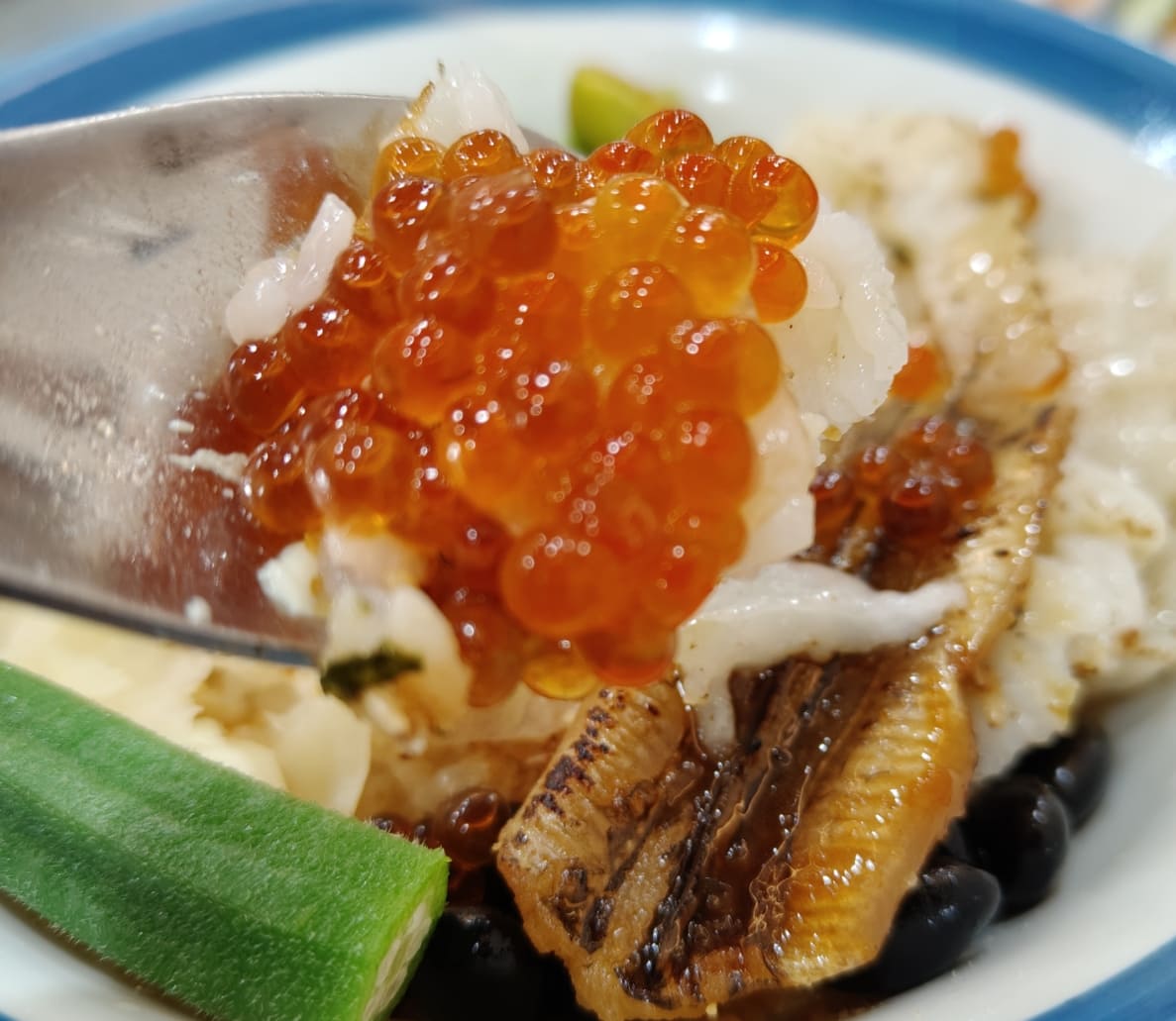 鮭魚卵啵啵爆汁,讓整碗多了驚喜口感,鹹香的海味在嘴裡綻開,配菜像秋葵、黑豆也讓味道更平衡,吃起來不膩口。