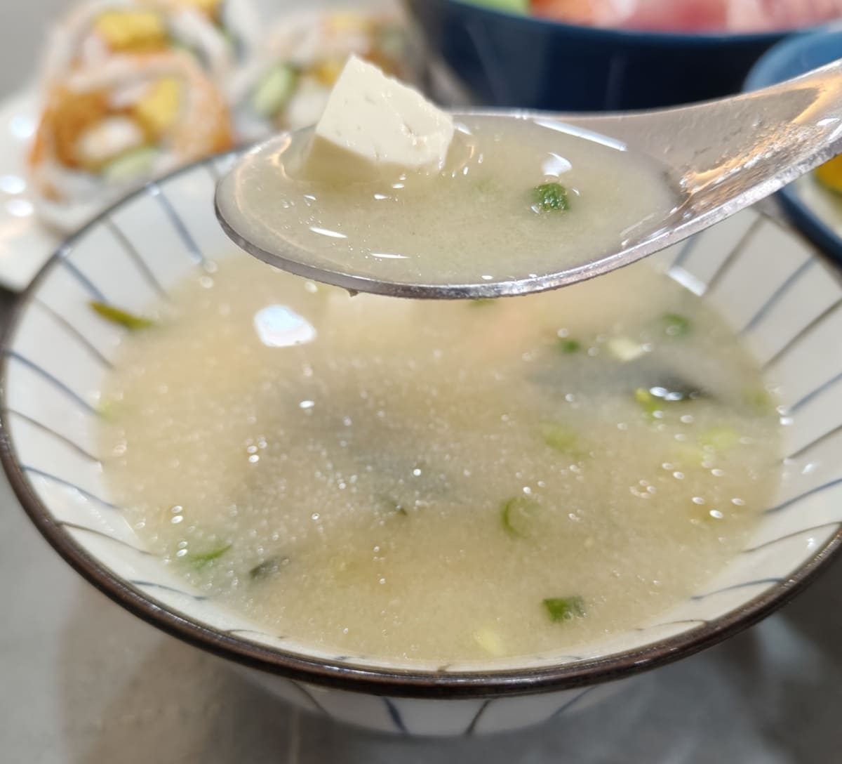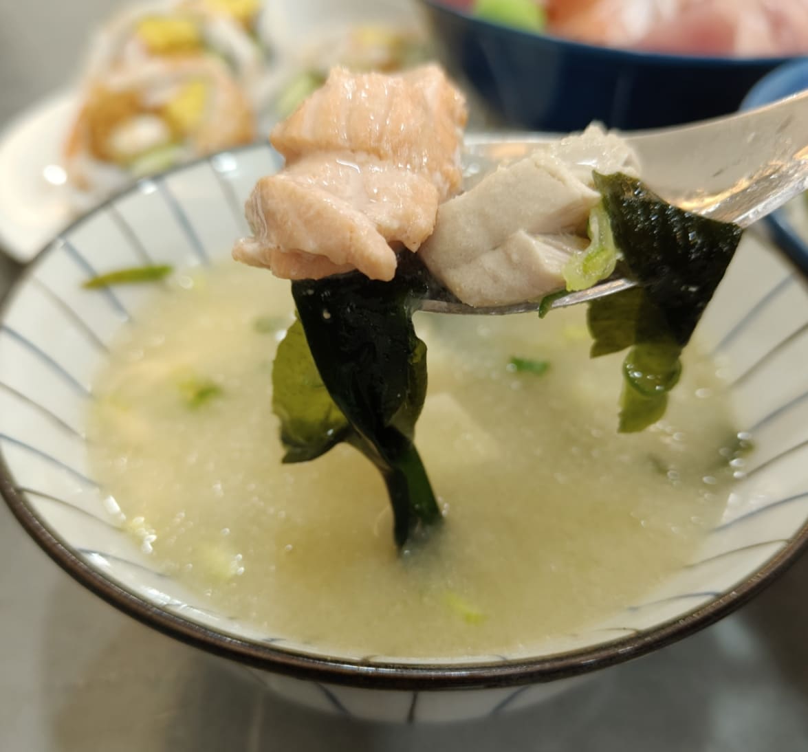 味噌湯料很多喝起來微微鹹香,豆腐滑嫩、魚肉大塊這碗挺划算的。