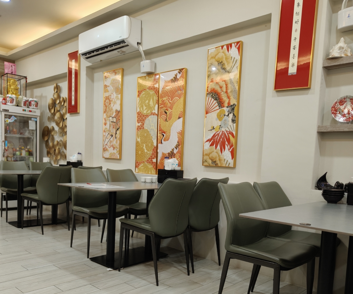 這裏空間不大,卻給人滿滿舒適感米白牆面搭配綠灰色皮椅,幾幅金紅色系的和風掛畫為整體增添一點柔亮氣息。
