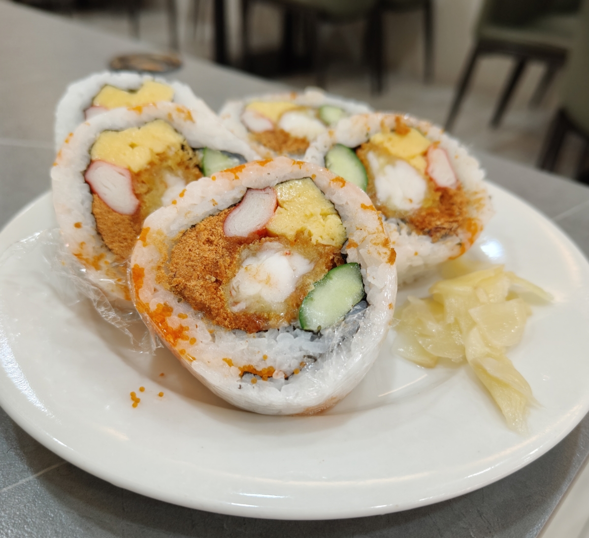 花壽司$120的用料給得很大方,一旁的薑片挺夠味的裡面有炸蝦、蟹肉棒、玉子燒、黃瓜,每一口都能吃到不同層次。